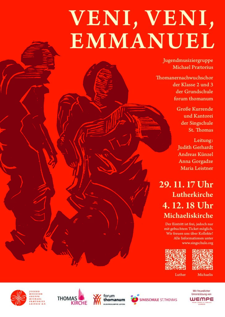 Am Vorabend des ersten Advents hüllen wir die Konzertbesucher in die ersten Klänge sowohl altbekannter, als auch unbekannter Adventslieder ein. Es haben sich erstmals die Singschule St. Thomas, der Thomanernachwuchschor der Grundschule forum thomanum und die Jugendmusiziergruppe “Michael Praetorius” zu einem gemeinsamen Konzertprojekt zusammengeschlossen.